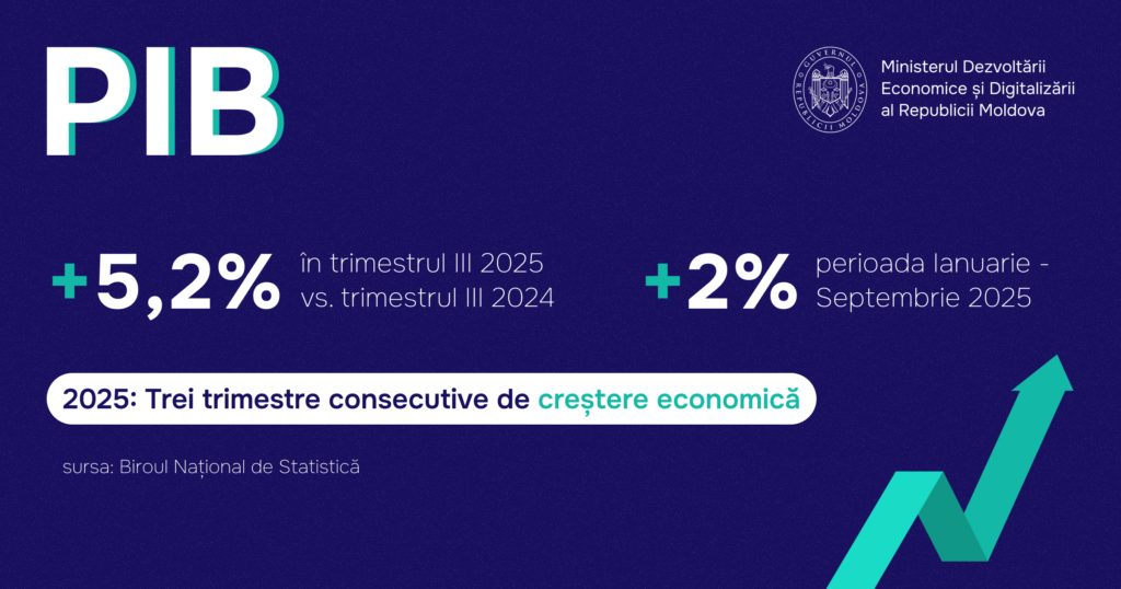 Procesul de redresare economică al Republicii Moldova continuă cu rezultate pozitive în cel de-al treilea trimestru al anului în curs. Produsul Intern Brut (PIB) al țării a înregistrat o creștere de 5,2% în această perioadă, contribuind la o creștere anuală cumulată de 2% de la începutul anului până în septembrie.