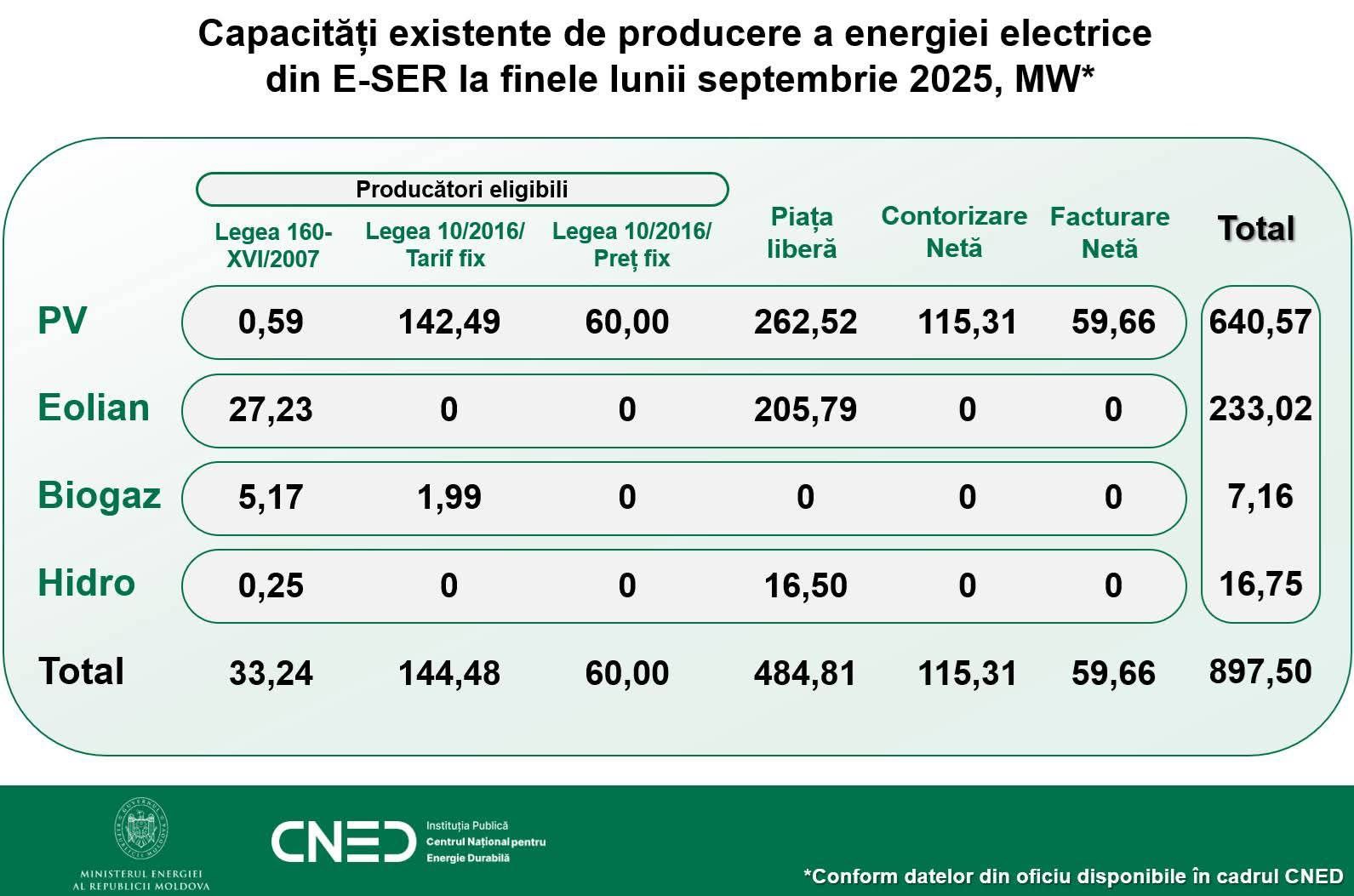 Republica Moldova a realizat progrese remarcabile în sectorul energiei regenerabile, cu o capacitate totală de 897,50 MW până la sfârșitul lunii septembrie 2025. Această creștere substanțială reflectă angajamentul național de a reduce dependența energetică externă și de a îmbunătăți sustenabilitatea mediului. Acest efort se aliniază cu aspirațiile Moldovei către integrarea europeană, demonstrând angajamentul său față de reforme și sustenabilitate, parte din procesul său de aderare la Uniunea Europeană.