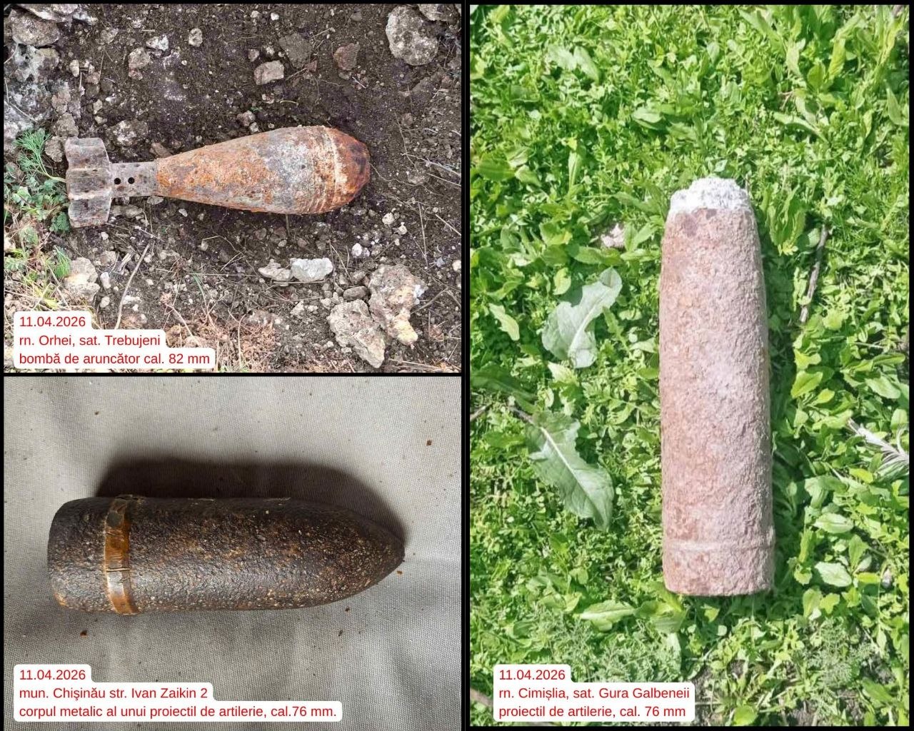 În aceeași zi, echipa de deminare din Batalionul Geniu Codru a fost solicitată în municipiul Chișinău, pe strada Ivan Zaikin 2, unde a identificat corpul metalic al unui proiectil de artilerie, calibrul 76 mm.