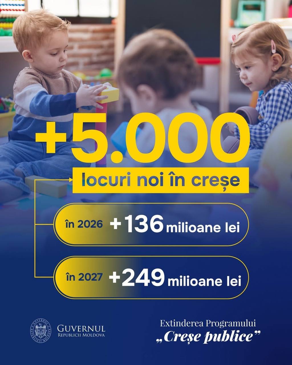Guvernul Republicii Moldova a anunțat o investiție semnificativă de 385,7 milioane de lei destinată extinderii capacității creșelor publice în perioada 2026-2027. Acest buget este de 20 de ori mai mare comparativ cu anul în curs, subliniind angajamentul autorităților de a sprijini familiile tinere și de a facilita revenirea părinților pe piața muncii.