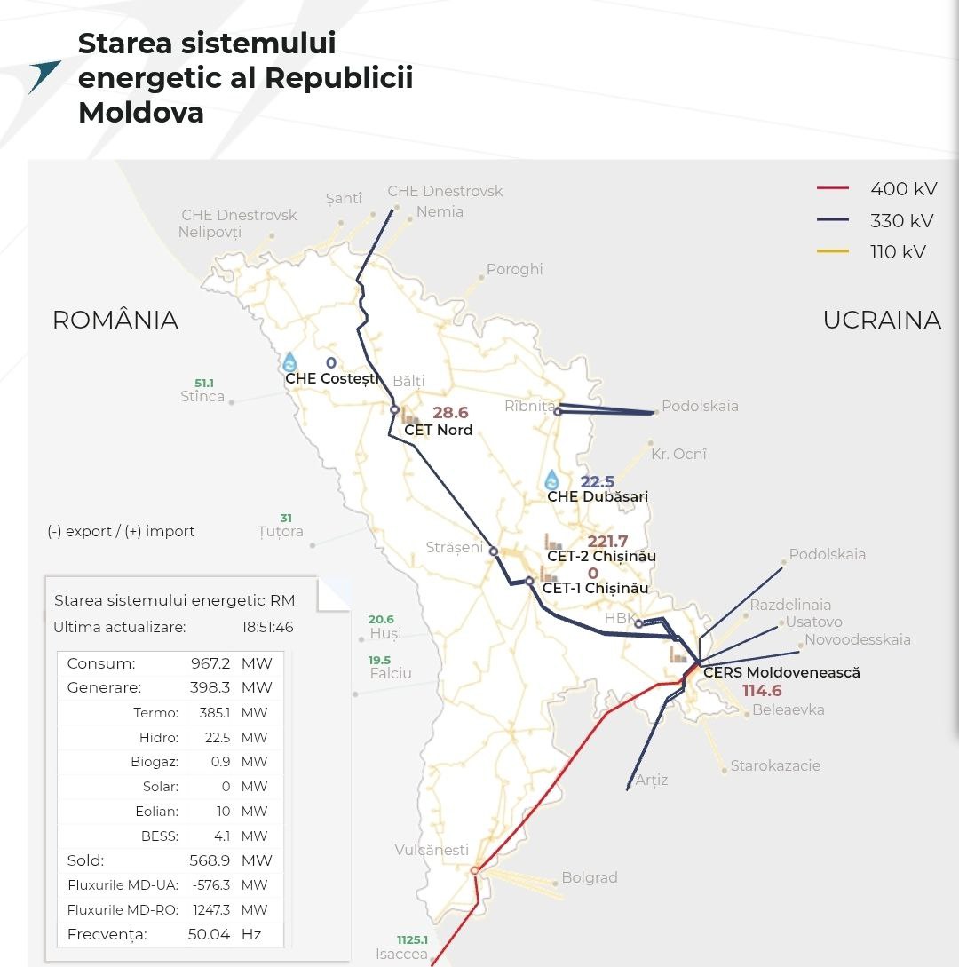 Înainte de restabilirea conexiunii la nodul energetic de la MGRES, aproximativ 205 MW de energie electrică erau importate din România prin interconectările de 110 kV, în regim de insulă. În plus, alte 320 MW erau tranzitate alternativ tot prin România.