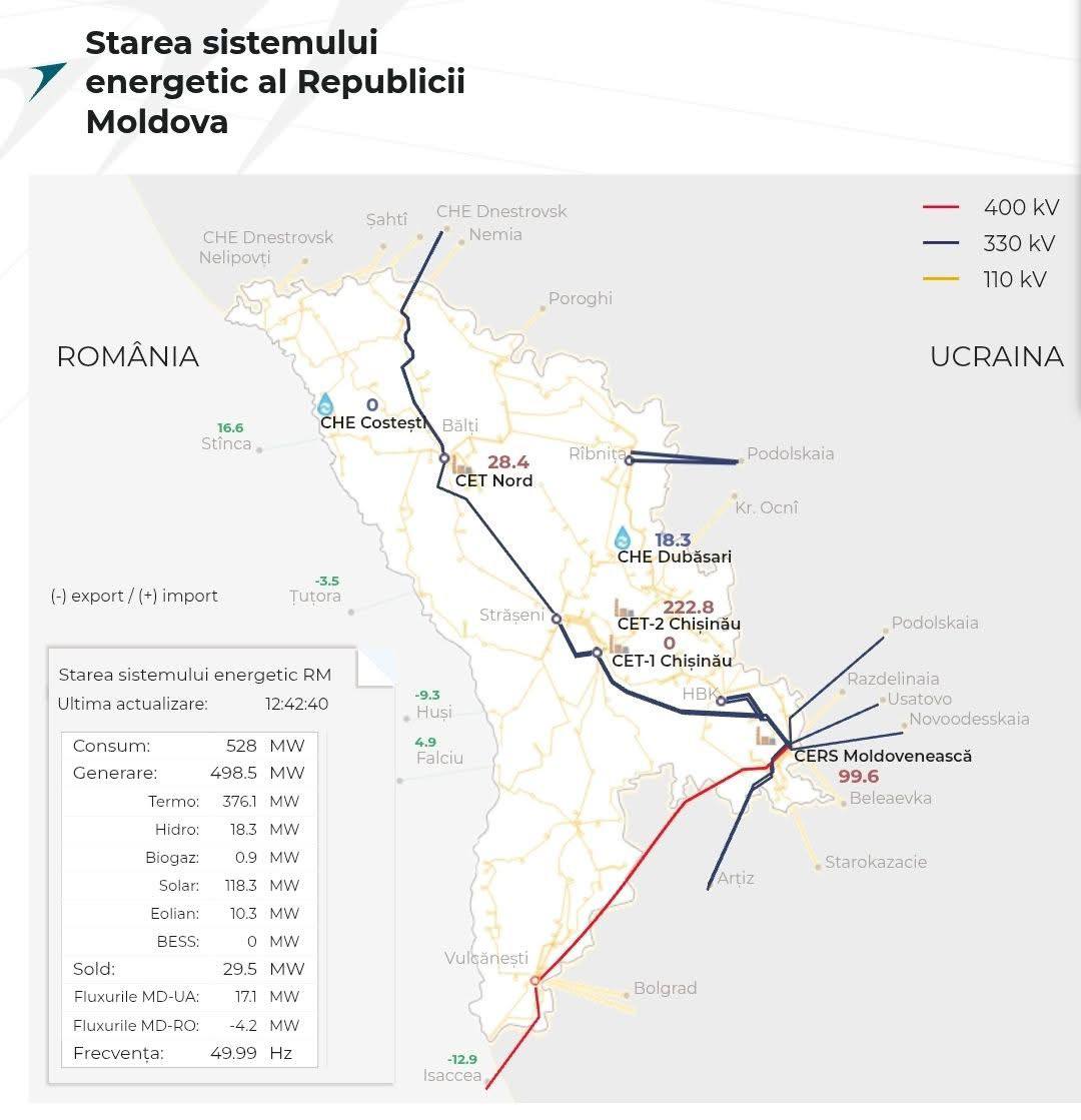 La o zi după un blackout parţial, Moldova a reușit să genereze 94% din energia electrică necesară prin surse interne, la ora 12:42. Cantitatea de energie importată era de doar 29,5 MW prin cele patru linii de 110 kV, conectate într-un regim insular cu sistemul energetic din România.