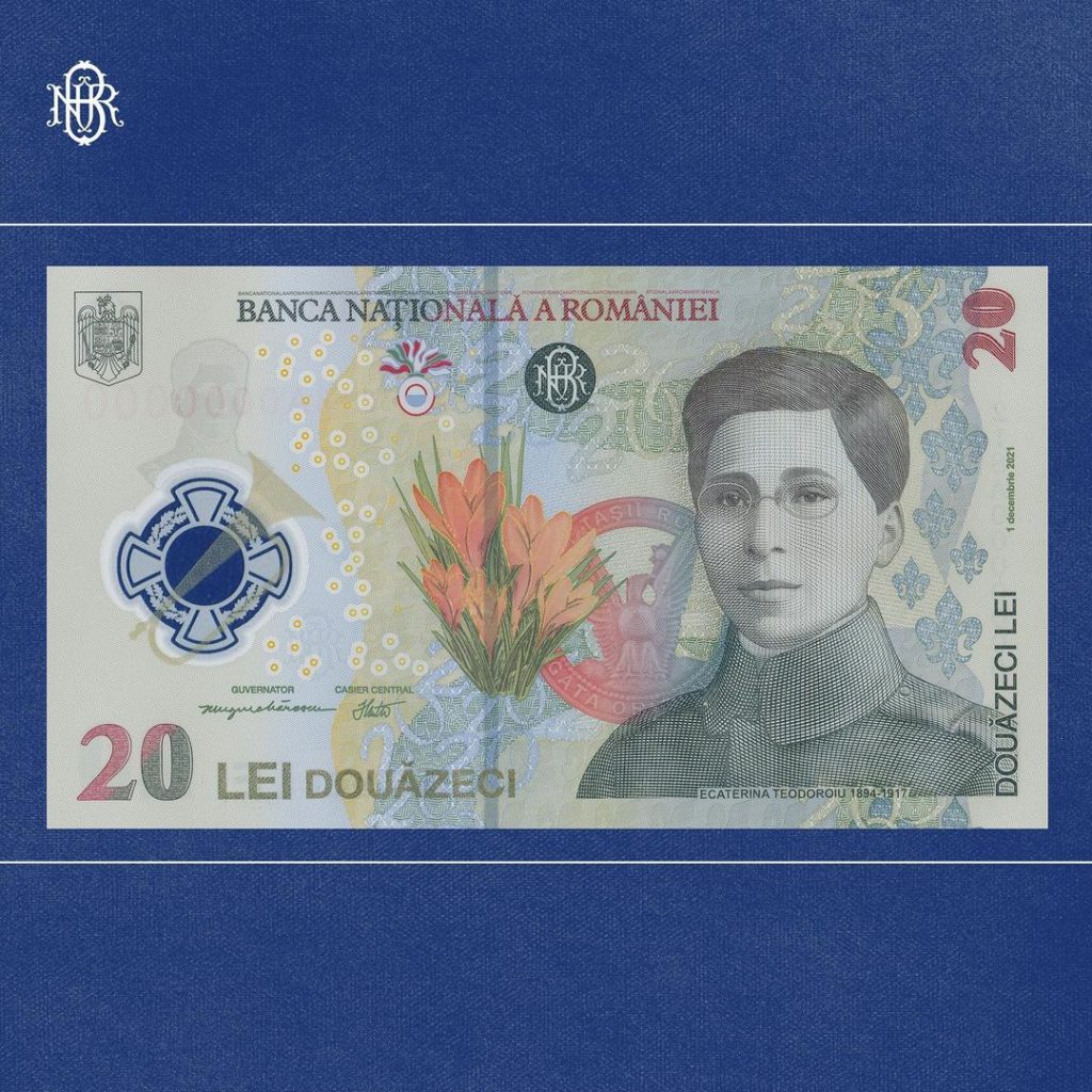 Banca Națională a României a introdus noua bancnotă de 20 de lei. Aceasta va fi pusă în circulație din 1 decembrie 2021 și este prima bancnotă cu putere circulatorie pe care apare o personalitate feminină, și anume Ecaterina Teodoroiu.
