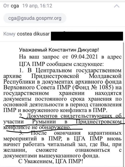 Activistului civic Dicusar Constantin a obținut răspunsurile oficiale de la Arhivele de Stat din Transnistria, SIS (Serviciul de Informații și Securitate al Republicii Moldova), cât și de la Ministerul Afacerilor Externe din România în care se constată lipsa oricăror dovezi documentare care ar vorbi despre o posibilă participare a României în războiul din Transnistria din 1992.