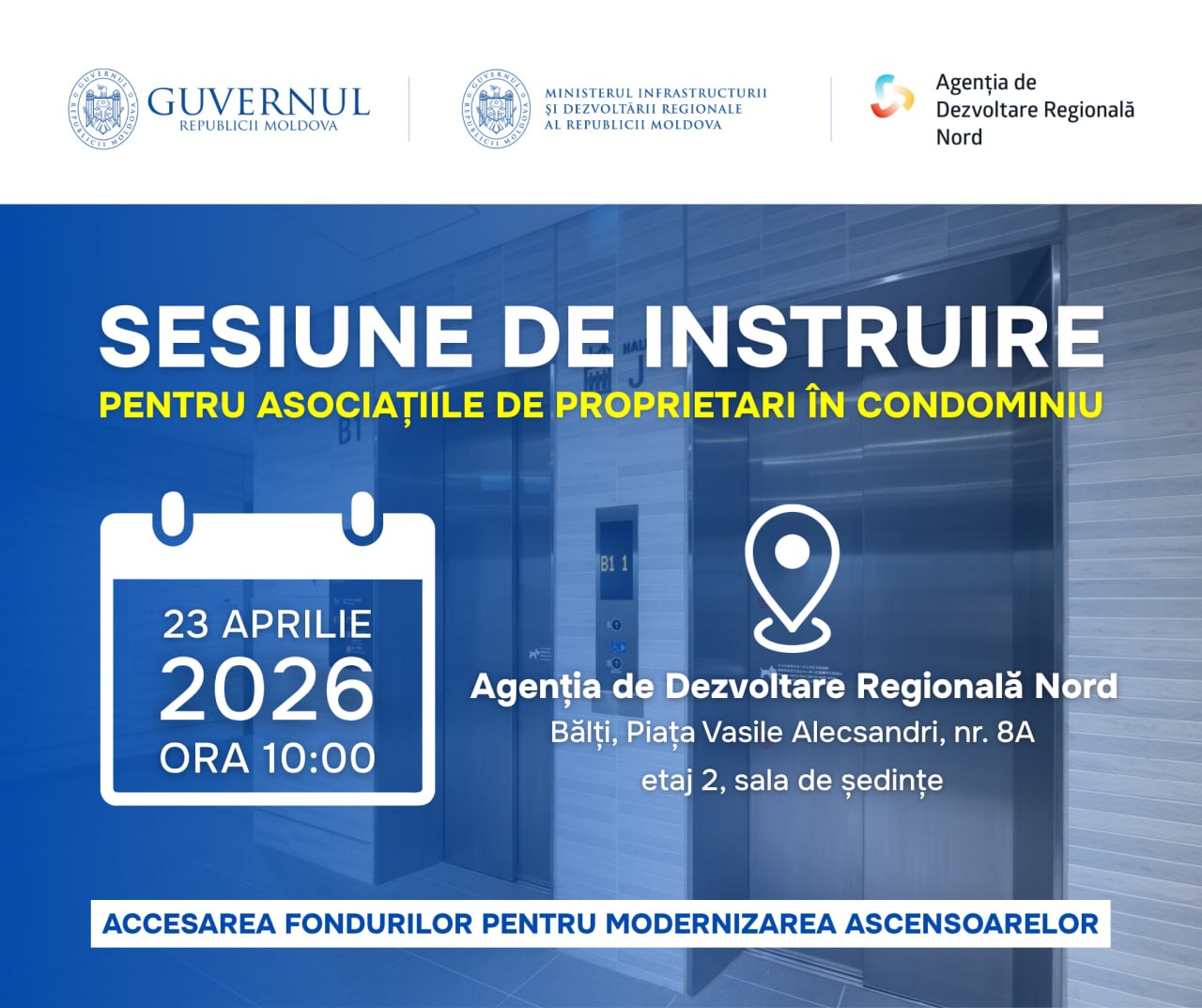 Agenția de Dezvoltare Regională Nord organizează o sesiune de instruire pentru administratorii Asociațiilor de proprietari în condominiu (APC) pe data de 23 aprilie 2026, la ora 10:00, în Sala de ședințe (etajul 2) a ADR Nord, situată în mun. Bălți, Piața Vasile Alecsandri, nr. 8A. În cadrul acestei sesiuni, participanții vor fi ghidați, pas cu pas, în procesul de completare și depunere a notelor conceptuale prin intermediul Sistemului informațional de management al proiectelor de dezvoltare regională și locală (mrdp.midr.gov.md), în contextul Concursului de selectare a proiectelor de dezvoltare regională – apel pe listă (ediția martie 2026), lansat de Ministerul Infrastructurii și Dezvoltării Regionale. Pentru detalii importante cu privire la eveniment, vă rugăm să accesați linkul: https://bit.ly/4tTrNUc.