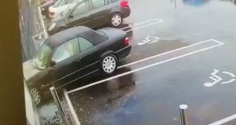Pe filmare se vede cum femeia se urcă la volanul BMW-ului parcat pe locul destinat persoanelor cu dizabilități și vrea să iasă cu spatele din parcare, dar din stânga ei apare o mașină.