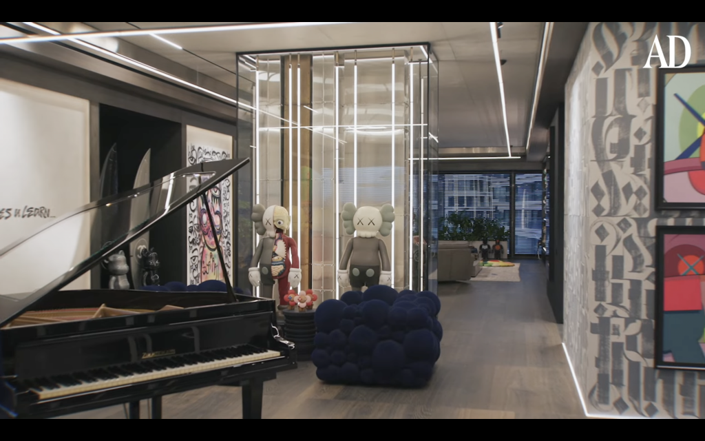 Aproape toți pereții din apartament sunt decorați cu diverse obiecte de artă. Etajele apartamentului sunt legate printr-un lift. La parter sunt situate dormitoarele copiilor, iar rapperul însuși locuiește la nivelul superior.