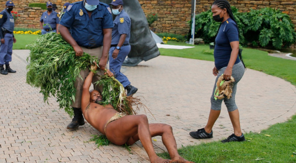 Plantația aparținea unor membrii ai comunității indigene Khoisan, care locuiesc de trei ani în corturi aflate lângă biroul președintelui Cyril Ramaphosa. Liderul lor, denumit Regele Khoisan, s-a agățat de o plantă mare de cannabis în timp ce era reținut de poliție.